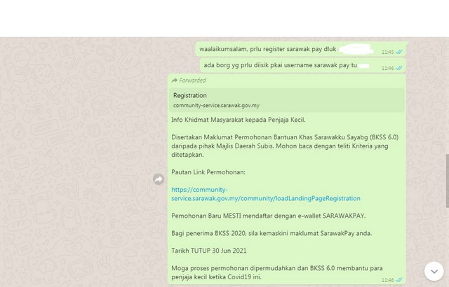 17 Jun 2021 | Aktiviti TerkiniSeperti sedia maklum, Kerajaan Sarawak telah mengumumkan fasa keenam Bantuan Khas Sarawakku Sayang (BKSS 6.0) melibatkan peruntukan berjumlah RM1.4 bilion dalam inisiatif terbaharunya meringankan beban rakyat menghadapi kesan penularan Covid-19 dan berikutan pelaksanaan Perintah Kawalan Pergerakan (PKP) 3.0 di negeri ini. Satu daripada bantuan yang diumumkan oleh pihak kerajaan negeri ialah Geran Khas berjumlah RM1,500 kepada golongan penjaja dan peniaga kecil yang berdaftar dengan Pihak Berkuasa Tempatan yang akan dibayar secara dua peringkat iaitu RM750 pada Julai dan RM750 pada Disember melalui Sarawak Pay. Walaupun staf PIK Peliau Bungai masih dalam fasa Bekerja Dari Rumah(BDR), petugas berusaha untuk membantu tidak kira secara atas talian atau bersemuka bagi memudahkan komuniti setempat memohon bantuan ini. Diharapkan bimbingan secara atas talian ini dapat memberi pencerahan kepada mereka yang ingin mengetahui lebih lanjut berkenaan bantuan ini.