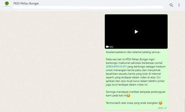 21 Februari 2022 | Aktiviti TerkiniPada 20 Februari 2022, Ahad, Pusat Ekonomi Digital (PEDi) Peliau Bungai telah mengadakan slot advokasi mengenali portal SEBENARNYA.MY bersama Komuniti PEDi Peliau Bungai secara atas talian dengan menggunakan aplikasi whatsapp yang bertujuan untuk memperkenalkan portal SEBENARNYA.MY yang dilancarkan oleh Suruhanjaya Komunikasi dan Multimedia Malaysia (SKMM) dalam menangani berita palsu yang tersebar luas di internet terutamanya di media sosial. Dengan adanya portal SEBENARNYA.MY, pengguna internet dapat menyemak kesahihan sesuatu berita yang tular sama ada berita tersebut benar ataupun berita palsu. Cara muat turun dan ciri-ciri aplikasi di dalam telefon pintar juga turut diselitkan di dalam perkongsian ini.