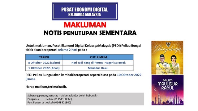 6 Oktober 2022 | Aktiviti TerkiniUntuk makluman, PEDi Peliau Bungai tidak akan beroperasi selama 2 hari sempena cuti umum Hari Jadi Yang di-Pertua Negeri Sarawak dan Maulidur Rasul seperti yang terdapat pada notis di bawah: