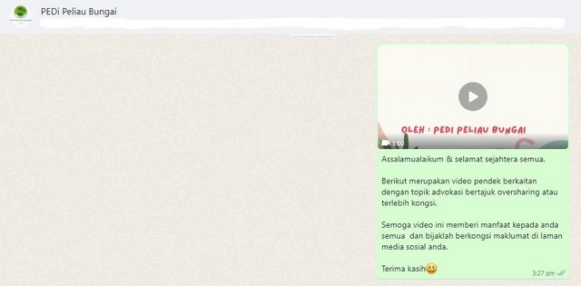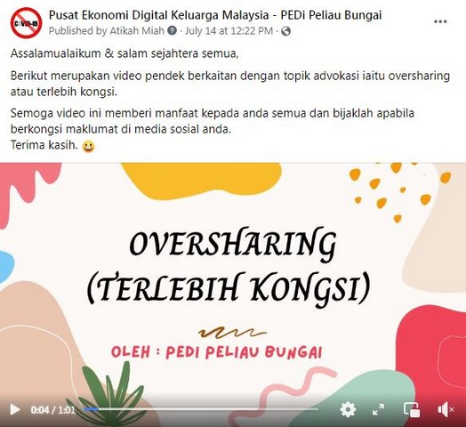 15 Julai 2022 | Aktiviti TerkiniPada 14 Julai 2022, Khamis, Pusat Ekonomi Digital (PEDi) Peliau Bungai telah membuat satu video ringkas mengenai topik advokasi yang bertajuk “Oversharing (Terlebih kongsi)”. Taklimat advokasi ini adalah bertujuan untuk memberi pendedahan kepada orang awam untuk sentiasa berfikir dahulu sebelum berkongsi maklumat peribadi kepada orang lain di media sosial dan sentiasa bijak apabila berkongsi sesuatu maklumat. Video ini berdurasi 1 minit 1 saat dan telah dimuat naik di laman Facebook PEDi Peliau Bungai dan juga aplikasi whatsapp. Dengan adanya perkongsian video ini diharapkan dapat memberi manfaat dan kebaikan kepada semua pengguna media sosial.