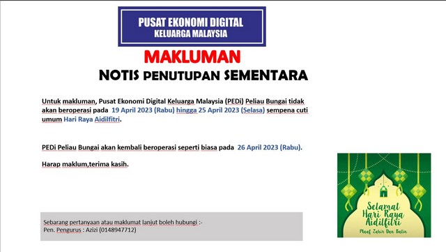 Pengumuman Penutupan Sementara PEDi Peliau Bungai Bersempena Sambutan Hari Raya Aidilfitri