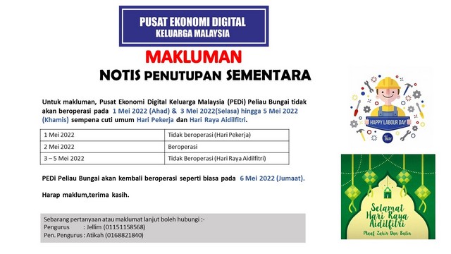 Notis Penutupan Sementara PEDi Peliau Bungai Sempena Cuti Umum Hari Pekerja dan Hari Raya Aidilfitri