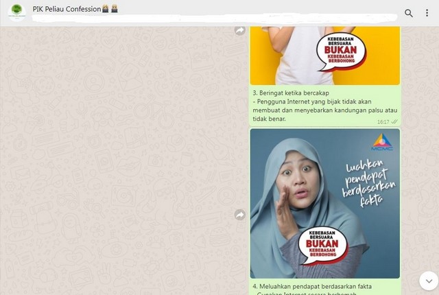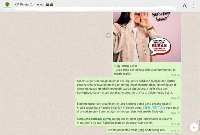 26 September 2021 | Aktiviti TerkiniPada 25 November 2021, Rabu dan Khamis, Pusat Ekonomi Digital (PEDi) Peliau Bungai telah mengadakan slot advokasi “Kebebasan Bersuara Bukan Kebebasan Berbohong” bersama Komuniti PEDi Peliau Bungai secara atas talian dengan menggunakan aplikasi whatssapp yang bertujuan untuk mempromosikan nilai-nilai positif yang harus diamalkan oleh pengguna internet terutama di dalam media sosial serta memberi fokus kepada impak berita palsu di dalam masyarakat. Terdapat lima garis panduan dalam menggunakan hak kebebasan bersuara iaitu beringat bila bercakap, bijak menilai, bercakap benar, luahkan pendapat berdasarkan fakta dan beri pandangan tanpa menyebarkan kebencian. Kesemua garis panduan ini amat penting untuk dijadikan rujukan dan ikutan para netizen supaya kesan negatif penggunaan internet dapat dikurangkan di samping dapat mendidik warga digital untuk lebih bijak dan berwaspada dalam menggunakan internet terutama di dalam media sosial dan sentiasa menyemak kesahihan di dalam portal SEBENARNYA.MY yang telah dilancarkan oleh Suruhanjaya Komunikasi dan Multimedia Malaysia.