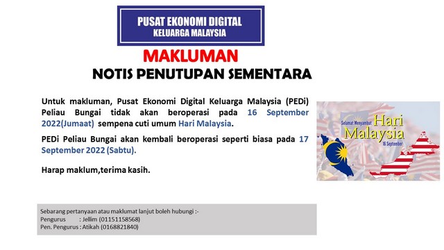 Untuk makluman, PEDi Peliau Bungai tidak akan beroperasi sempena cuti umum Hari Malaysia seperti yang terdapat pada notis di bawah: