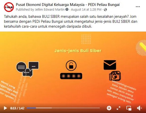 15 Ogos 2022 | Aktiviti TerkiniPada 14 Ogos 2022, Ahad, Pusat Ekonomi Digital (PEDi) Peliau Bungai telah membuat satu video ringkas advokasi bertajuk Buli Siber. Video ini adalah bertujuan untuk mendedahkan pengguna media sosial mengenai buli siber, jenis buli siber, kesan dan cara mencegah daripada menjadi mangsa buli. Durasi video ini adalah 1 minit 42 saat dan telah dimuat naik di laman Facebook PEDi Peliau Bungai. Dengan adanya perkongsian video ini diharapkan dapat memberi manfaat kepada semua pengguna media sosial.